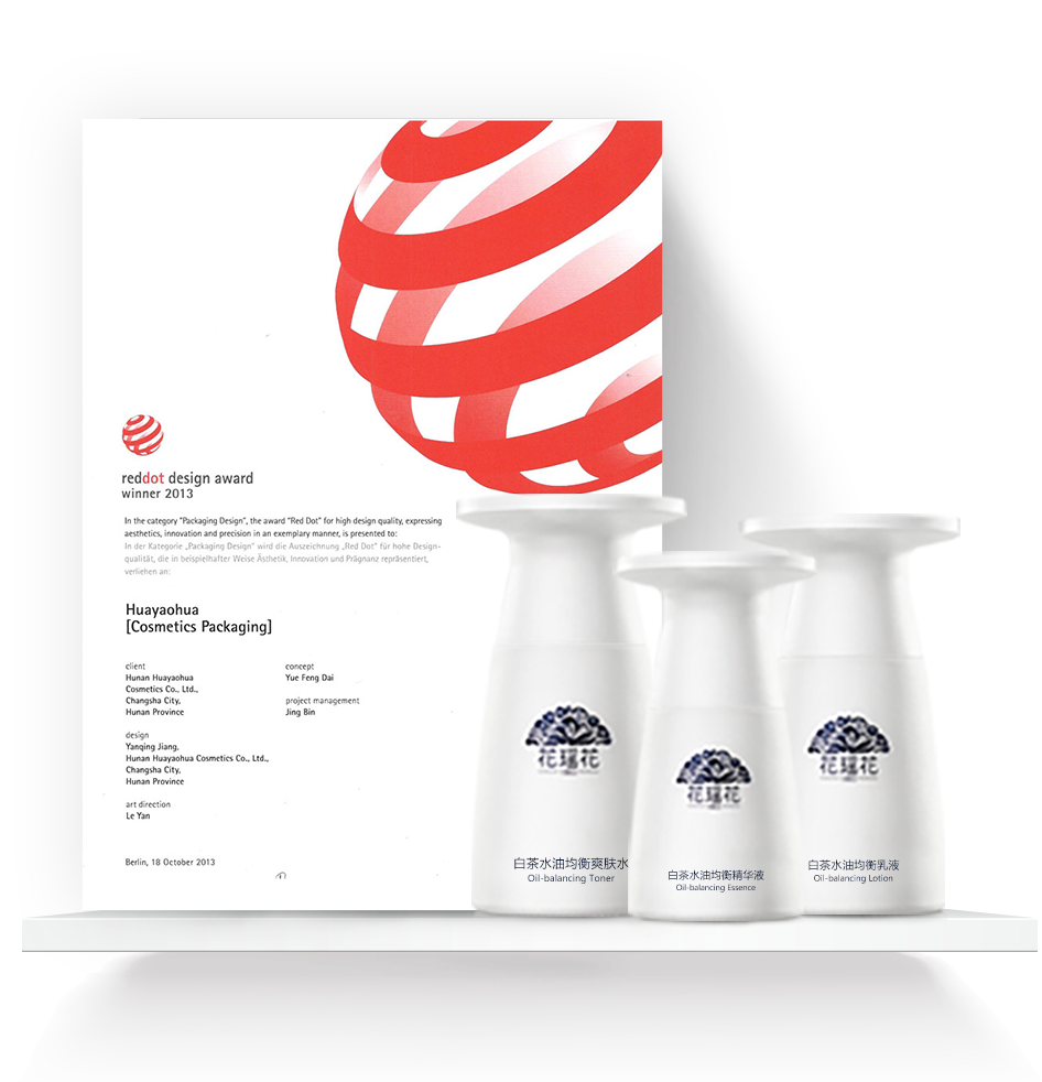 2014年,设计团队凭借旗下花瑶花品牌的民族元素运用和匠心独运的设计,成功斩获具有”设计界的奥斯卡“之称的德国红点设计大奖,成为中国首个获得该奖顶的化妆品品牌。